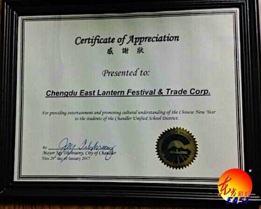 自貢燈貿(mào)集團(tuán)股份有限公司、四川藝思特彩燈文化傳播有限公司主辦的“2016世界之光——彩燈嘉年華”跨年燈展,于當(dāng)?shù)貢r(shí)間2017年1月29日在美國(guó)亞利桑那州首府菲尼克斯(鳳凰城)順利落下帷幕。成都市委副秘書長(zhǎng)、印第安納州州長(zhǎng) Burns Mike及當(dāng)?shù)卣獑T出席閉幕式并代表州政府對(duì)本次燈展頒發(fā)特令嘉獎(jiǎng)。